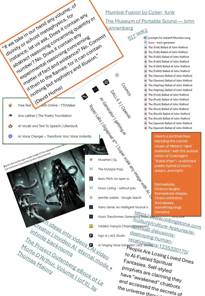 Themes include: Q? can AIs write poetry, I mean, GOOD poetry? Answer: indeed they can. Conclusion: so what? Q? Do the AIs talk to each other at night when the humans are asleep? Answer: seems they do, or, in any case, you can get two AIs to talk to each other without human intervention (we’ve done a lot of work on this one), basically asking the Q: what is AI poetry ie poetry written by AIs for other AIs?