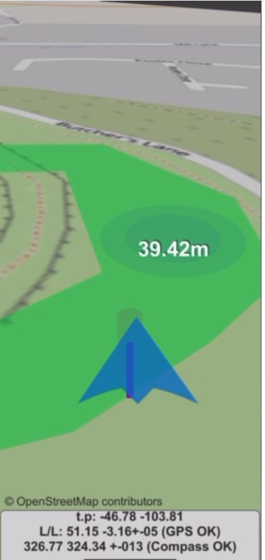 This is what you will see on your screen. I am the blue arrow. It points the direction I am heading. The coloured blob is ‘a soundpool’. containing the poems. When I move into the soundpool, the poetry is triggered by my phone’s gps. Play with it, see what happens when you go out of the soundpool, then back in again!